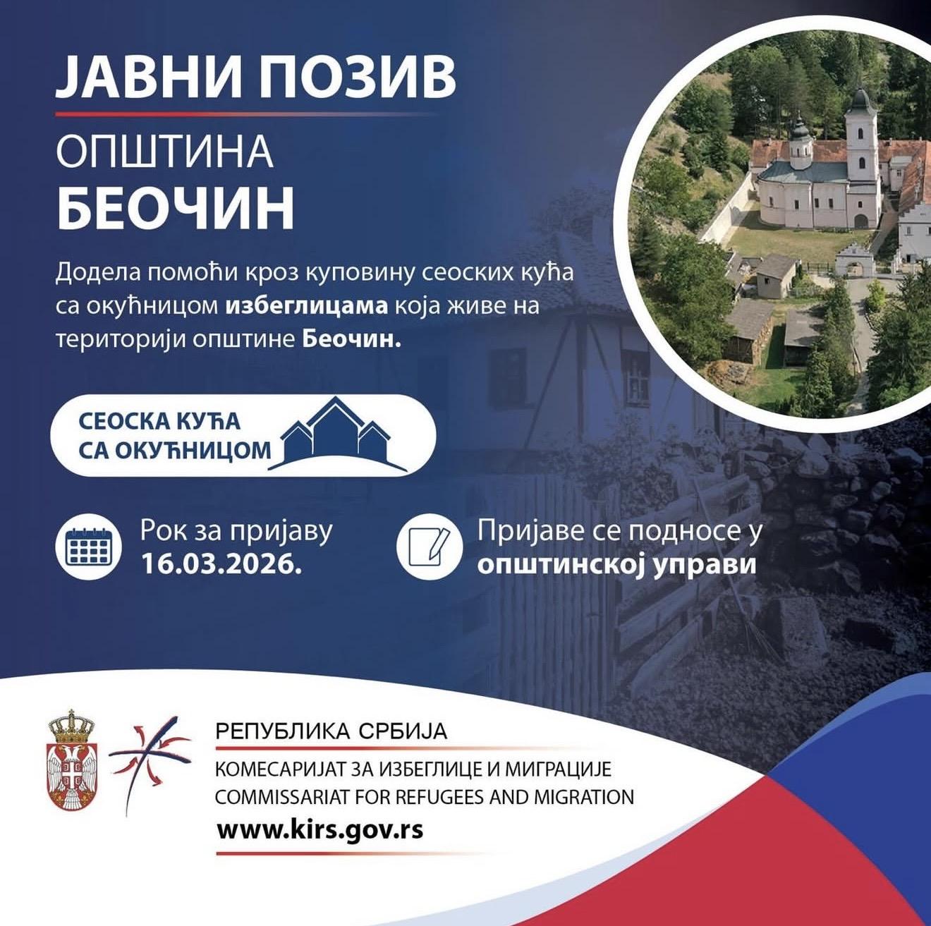 Na Javni poziv mogu da se prijave sve izbeglice i bivše izbeglice koje imaju prijavljeno boravište/prebivalište na teritoriji opštine Beočin a rok za podnošenje prijava je 16. mart 2026. godine. Prijave se podnose u Opštinskoj upravi Beočin.