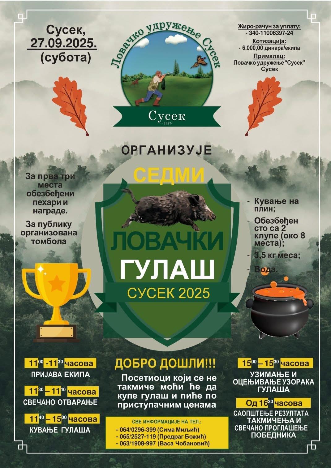 U organizaciji Lovačkog udruženja „Susek“ a pod pokroviteljstvom Opštine Beočin u subotu 27. septembra, beočinsko selo Susek biće domaćin sedme manifestacije „Lovački gulaš“.